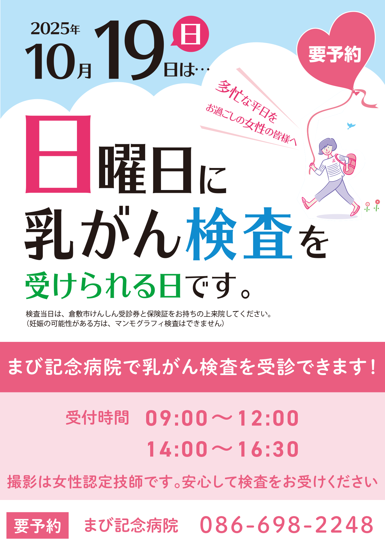 2025年10月19日(日)は乳がん検診(視触診&マンモグラフィ)ができる日です。