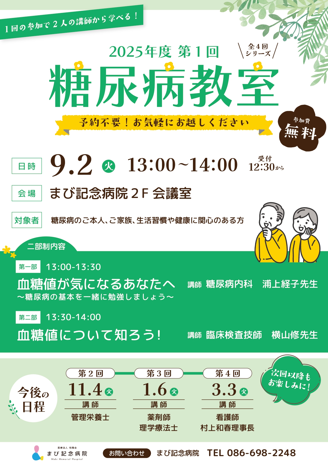 当院では糖尿病を正しく理解していただき、糖尿病の予防や糖尿病と上手にお付き合いできるように、定期的に糖尿病教室を開催いたします。医師、看護師、栄養士、理学療法士、検査技師がチームを組んで行います。どなたでも参加できますので、ぜひ一緒に糖尿病について学びましょう!